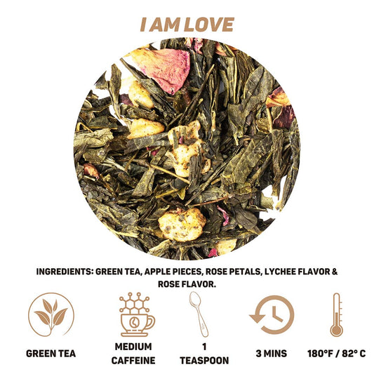 I am Love - Exquisite Green Tea Blend, with Rose Petals, Apple Pieces and Lychee Flavor - a Delightfully Refreshing and Romantic Tea Experience. 5 oz pouch.